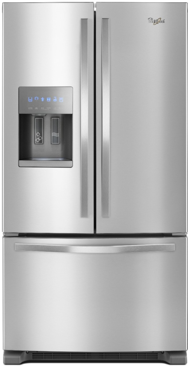 Organize foods for your family in this Whirlpool® French door refrigerator available in fingerprint-resistant stainless steel. A humidity-controlled double crisper and two-tier freezer storage provide plenty of room. Spillproof shelves help contain spills and for filtered water right at hand, this refrigerator features an exterior water dispenser with EveryDrop® ice and water filtration.Read More