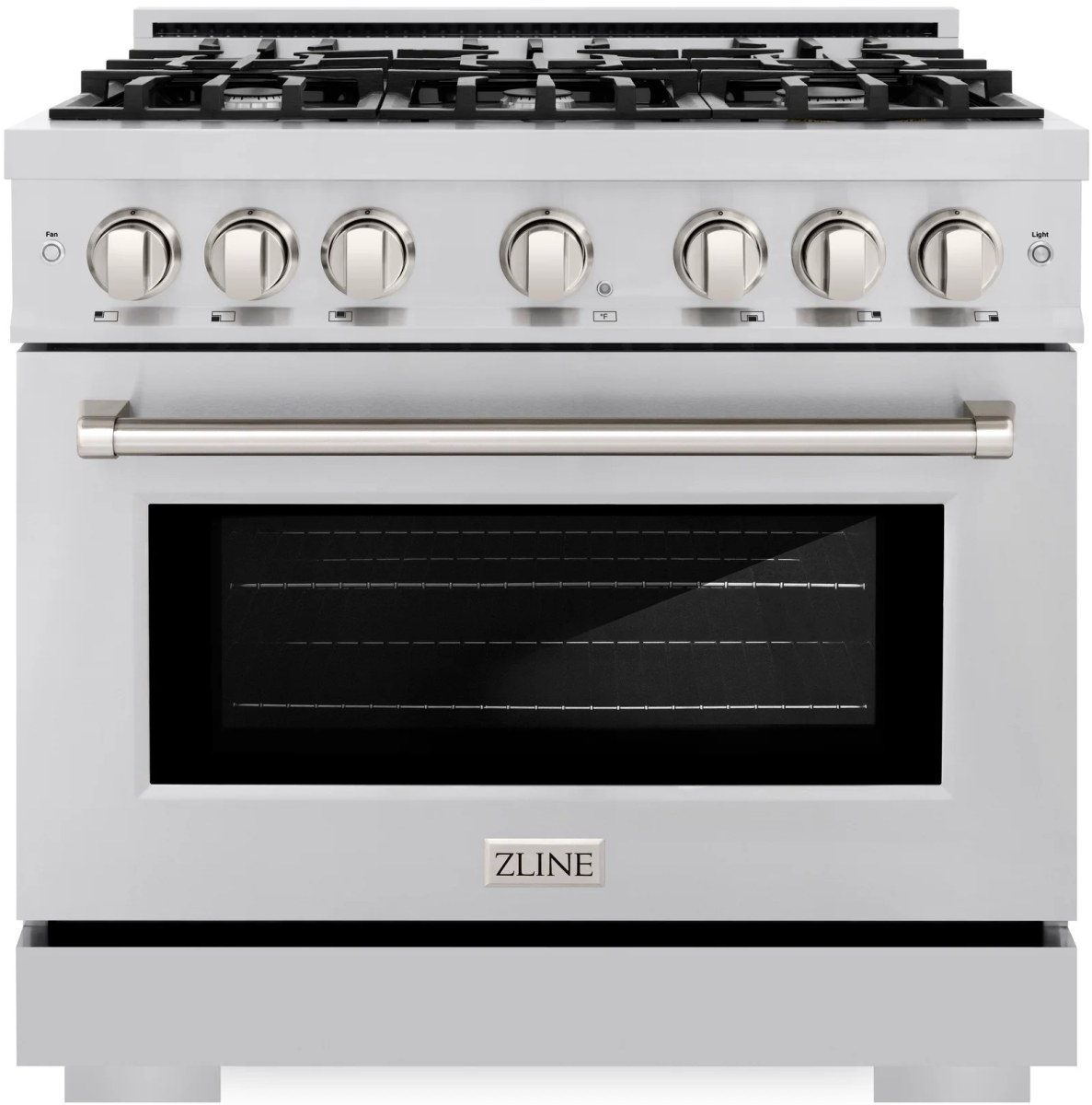 The ZLINE 36 in. 5.2 cu. ft. Select Gas Range with 6 Burner Cooktop and Convection Gas Oven in Stainless Steel (HGR36) combines the elegance of a hand-finished porcelain gas cooktop with 6 Italian-made auto-reignition burners, a gas convection oven with an energy-efficient cooling fan to ensure quiet operation, and a Horizon oven door window design allowing you to master every meal.